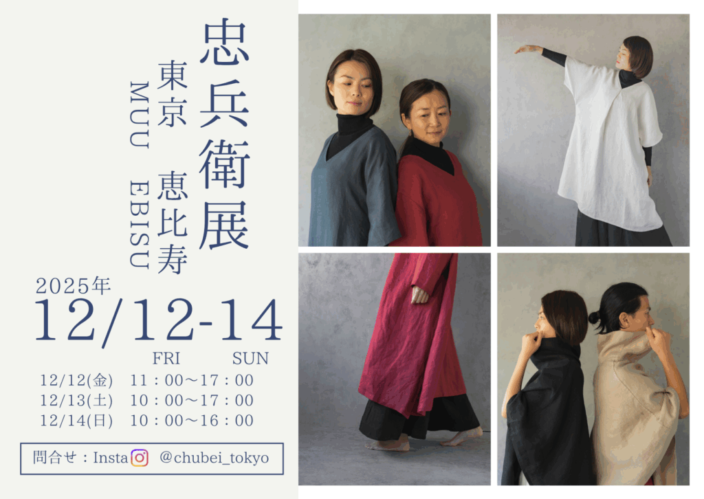 2025年12月12〜14日 東京・恵比寿で展示販売会を開催いたします。 冬の麻の楽しみを、みつけにきてください。 お問い合わせはこちらまで https://www.instagram.com/chubei_tokyo/